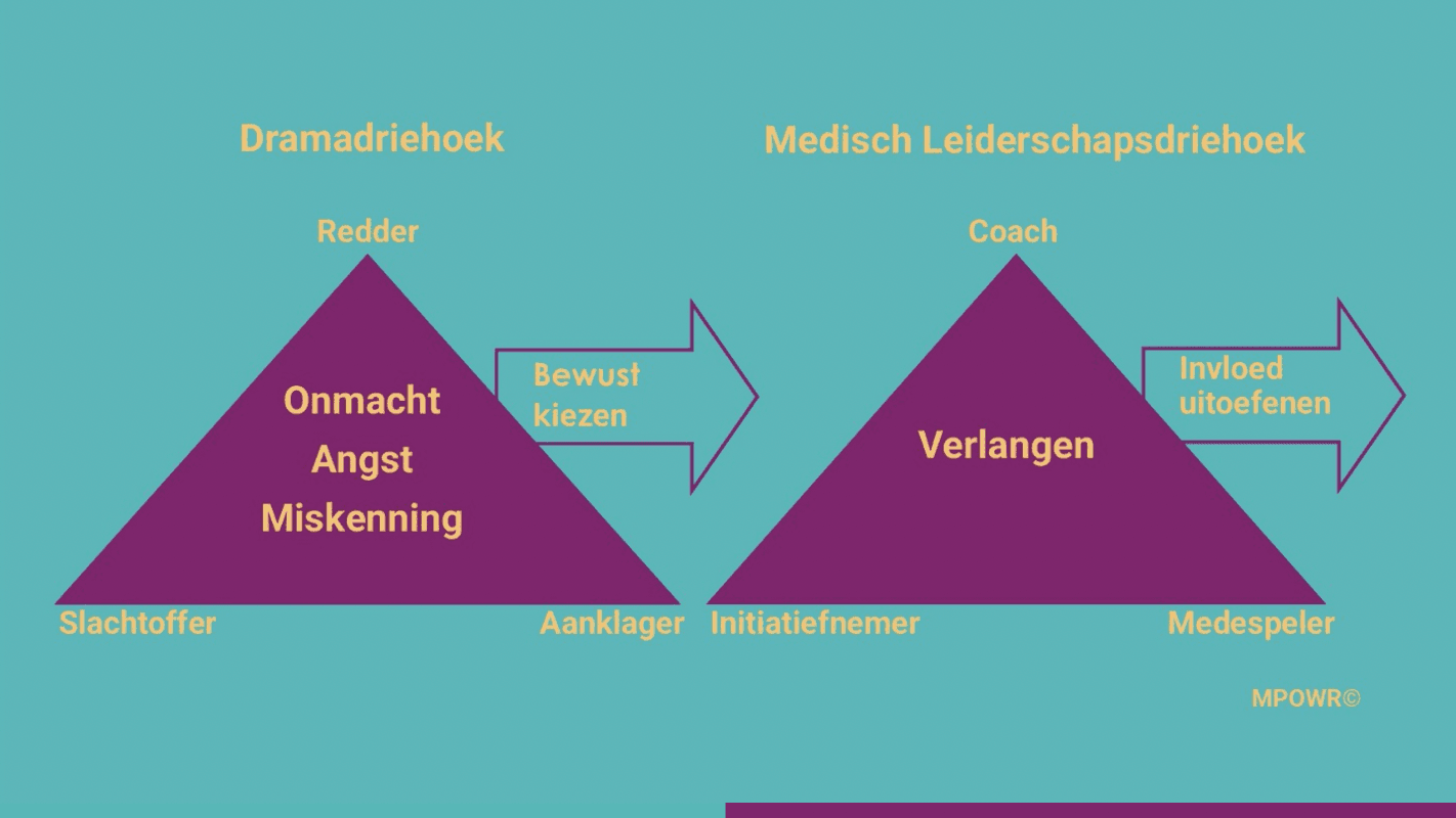 De negatieve cirkel kennen we ook allemaal: vermoeidheid en stress zorgt ervoor dat je brein in overleving stand komt en weg van bevlogenheid: Je primitieve brein laat je in de ‘dramadriehoek’ terecht komen, zodat je ‘redder’, ‘slachtoffer’ of ‘aanklager’ wordt. Al deze rollen geven kortdurend comfort. Maar uiteindelijk zit bij ieder van deze drie rollen de verantwoordelijkheid niet op de gezonde plek en geeft het geen echte verandering van de situatie. Bovendien nodigen ze ook mede klagers en mede slachtoffers en mede redders uit. Iets wat we op dit moment in de zorg heel veel zien gebeuren. En dat haalt zorgprofessionals weg bij hun bevlogenheid.