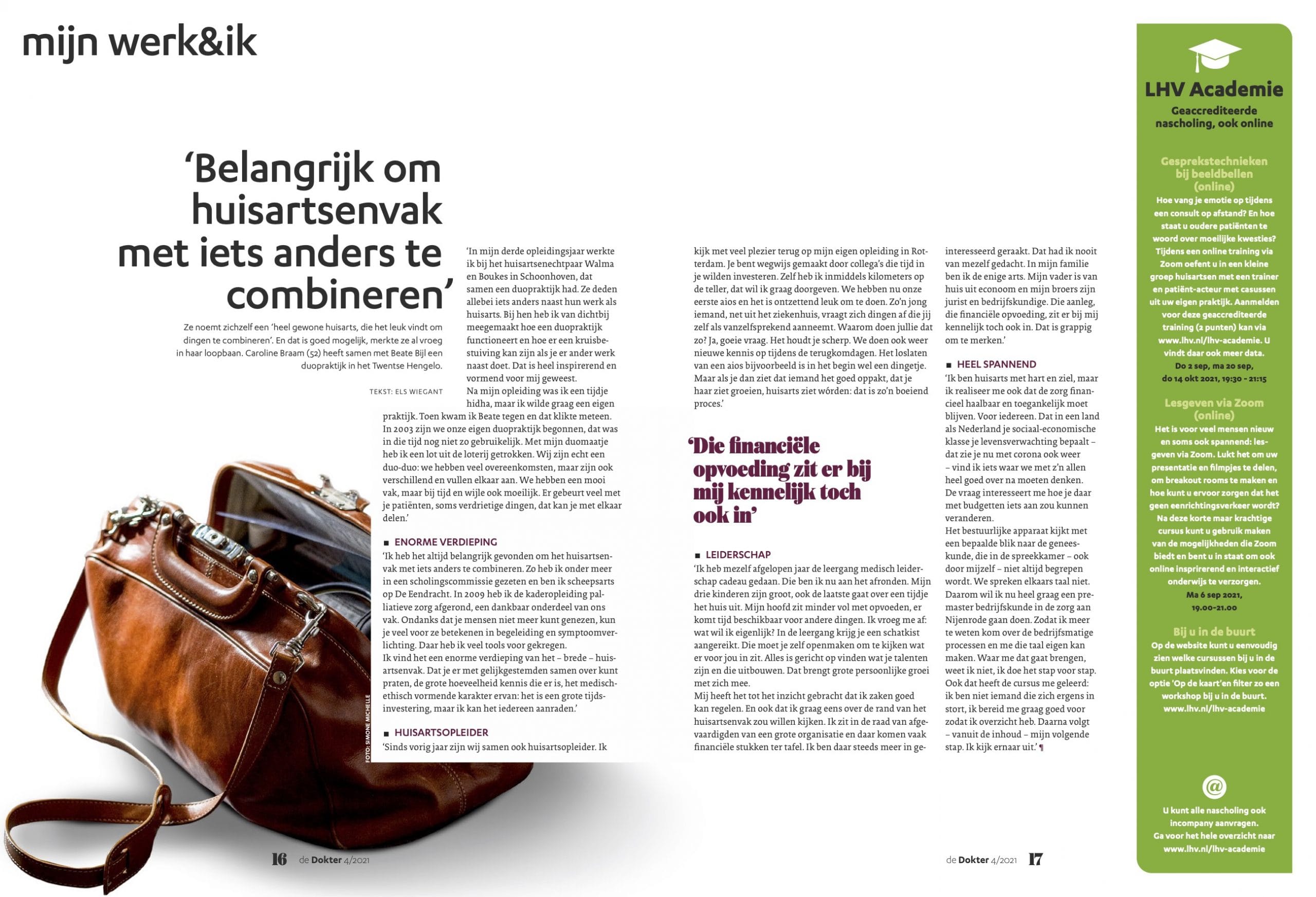 In juli 2021 werd Caroline Braam, één van onze alumni, geïnterviewd in De Dokter, het blad van de Landelijke Huisartsen Vereniging, voor de rubriek ‘Mijn werk en ik’.