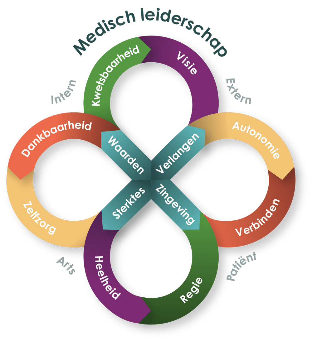 Jouw medisch leiderschap heeft het meeste impact, wanneer het in beweging is. In dit model wordt dit weergegeven door een dubbele lemniscaat: de beweging zorgt ervoor, dat jij in ieder moment weer opnieuw bepaalt, wat er voor jou op dít moment de meeste aandacht nodig heeft om goede zorg te leveren. Overigens kunnen ook stilte, stilstaan en niets doen voor beweging zorgen!